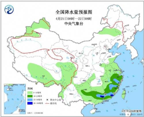 图1 全国强降雨落区预报图(4月19日08时-20日08时)