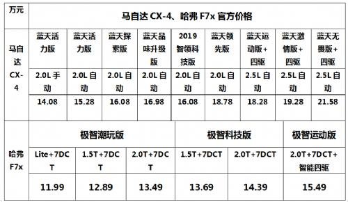 虽说,现在是一个看品牌的时代,但是在汽车领域,自主品牌与国外品牌的差距其实正在逐渐缩小,尤其是像哈弗之类的自主品牌,在综合表现上更是持平甚至领先部分合资或进口品牌汽车。用品质说话,抛开外观这种主观性较强的因素来说,哈弗F7x从空间、动力和智能安全上都比马自达CX-4卓越不少,本以为其价格会比马自达CX-4高出些许,但仔细看价格呈现,确实让人大跌眼镜。比较底配和顶配车型,从底配来说,哈弗F7x极智潮玩版售价11.99万,比马自达CX-4蓝天活力版便宜2.09万元。从顶配看,哈弗F7x极智运动版价格为15.49万元,比马自达CX-4蓝天无畏版实惠6.09万元。相较之下,哈弗F7x的价格更显真诚。头顶合资品牌的光环,马自达CX-4在价格上充满活力和无畏精神,而在汽车品质上,相信消费者会有自己的选择。