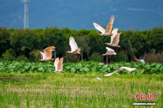 朱鹮成群飞过陕西汉中的稻田。 李吉安 摄