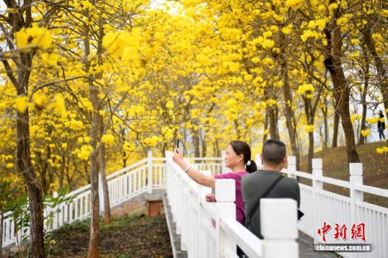 图为广西南宁青秀山风景名胜旅游区黄花风铃木盛放,游人赏花踏青。(资料图)俞靖 摄
