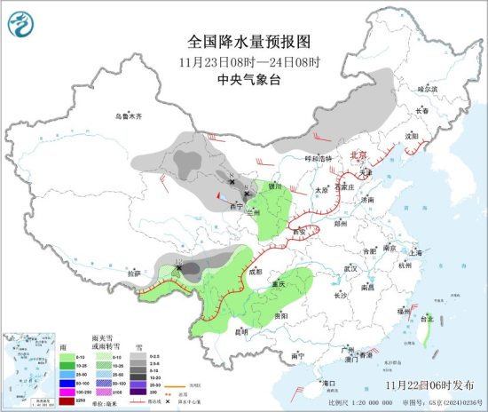 11月23日08时至24日08时,甘肃西部、内蒙古中部、西藏东部、川西高原北部等地的部分地区有小雪或雨夹雪,其中,西藏东北部、川西高原北部、甘肃西部等地的部分地区有中到大雪,局地暴雪(10~12毫米),新增积雪深度4~8厘米,局地可超过10厘米;甘肃东部、宁夏、陕西西南部、四川西部、重庆、云南北部、贵州西北部等地部分地区有小雨。内蒙古中西部、青海北部、陕西北部等地部分地区有5~6级风,阵风7~9级;巴士海峡、南海东北部和中东部有6~7级风,阵风8级。