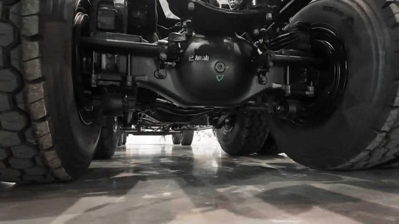 东风天龙KC纯电自卸车是8×4驱动形式,搭载了汉德300轮减桥,匹配6.73大速比。轮减桥能把电机的动力进一步放大,承重能力远超普通后桥,而且轮减桥的结构设计让整车离地间隙更高,面对山区坑洼路、碎石路时,不容易刮擦底盘,现在已经渐渐成了重载自卸车的标配。