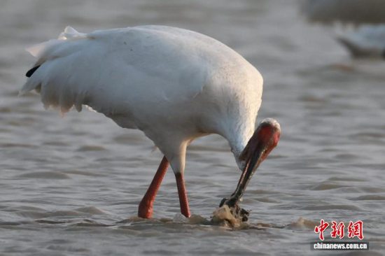 12月17日,在鄱阳湖畔的江西省南昌市五星白鹤保护小区,一只在水中觅食的白鹤。 记者 刘占昆 摄