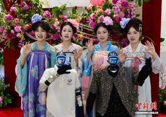 活动当天,身穿菏泽曹县汉服的工作人员与机器人共同欢迎海内外宾朋来菏泽赏牡丹。李明芮 摄